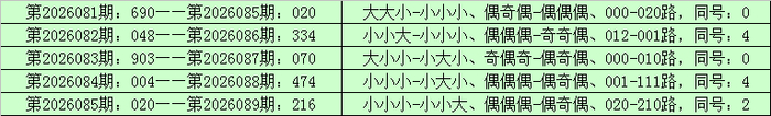 所以,排列三第2026081期奖号:690,与排列三第2026090期奖号可能没有同号。或者排列三第2026090期奖号大小比、奇偶比和012路比可能与第2026081期奖号直选形态:大大小、偶奇偶和000路不全部相同。